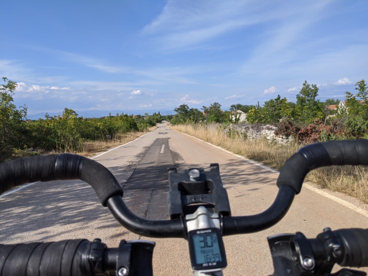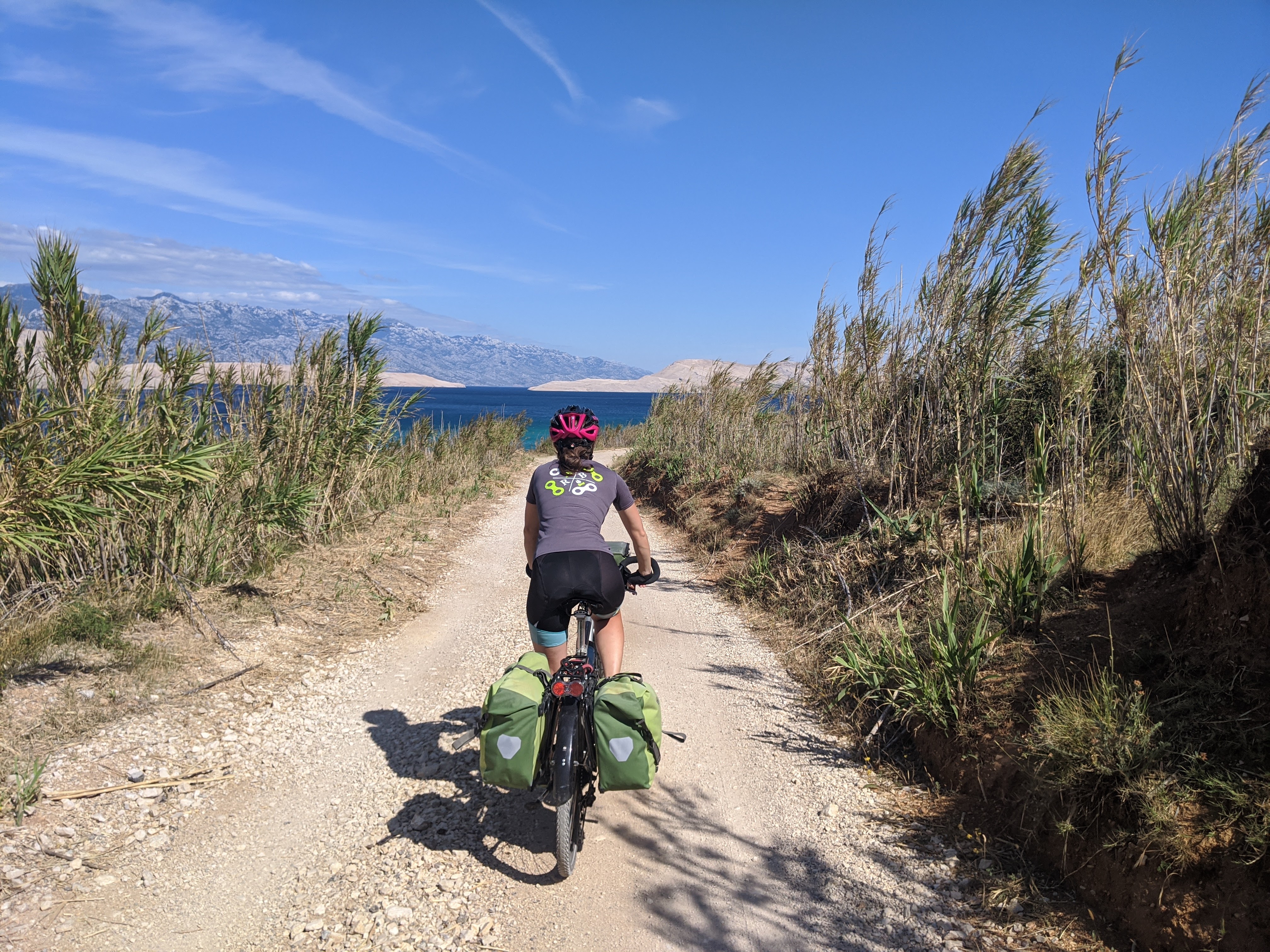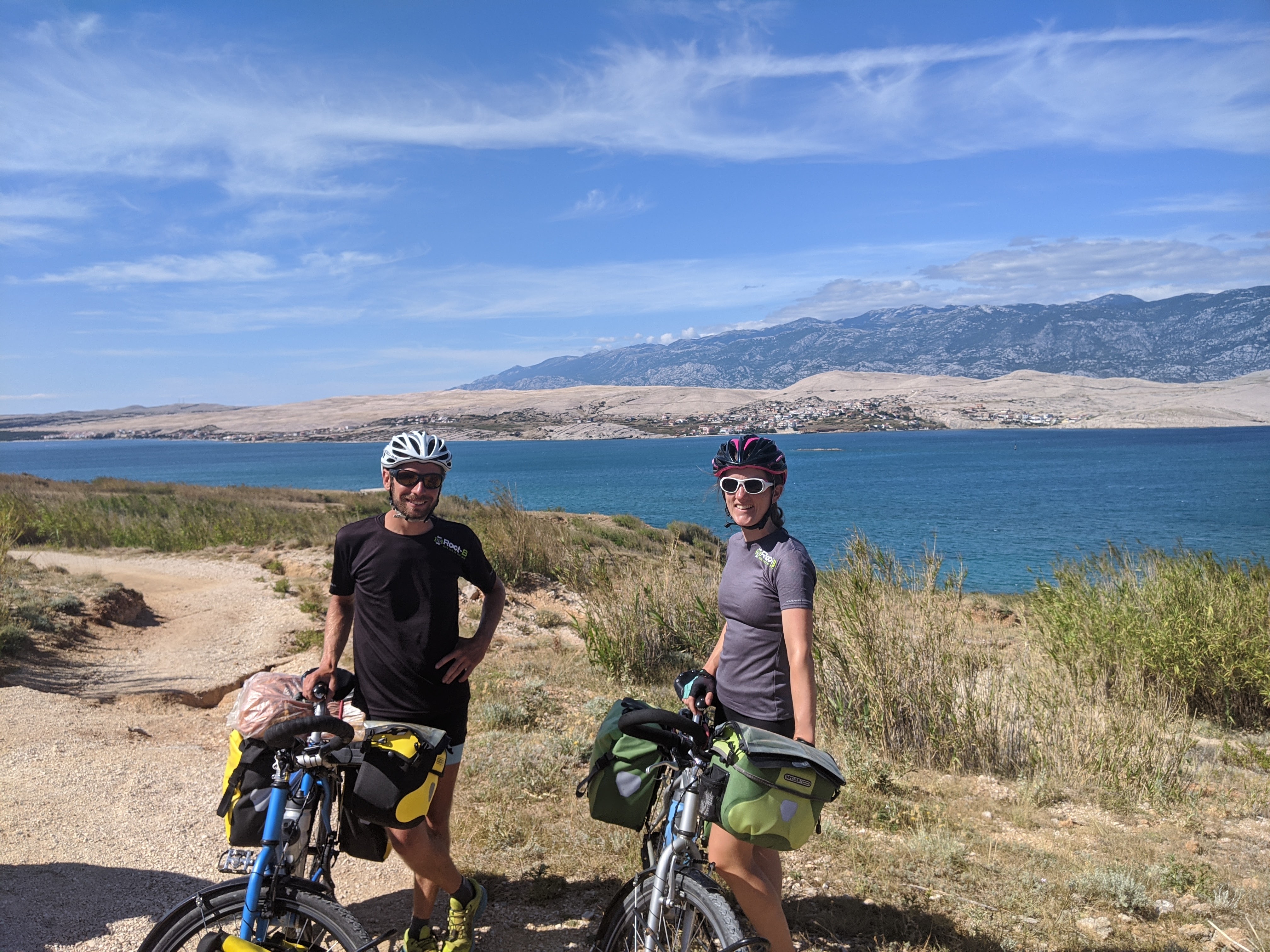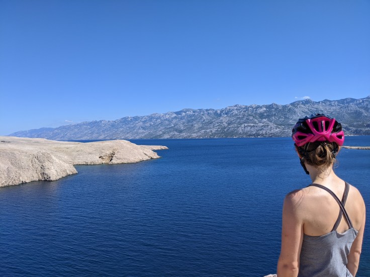 Nous avons un bateau le lendemain midi, bien plus petit que celui de la veille et qui cette fois-ci accepte les vélos. Nous serons d’ailleurs 6 passagers et que des cyclistes ! Toujours aussi arides, les paysages sont assez différents sur l’île de Pag. Ici on pédale au milieu des oliviers bordés de murets en pierres sèches avec bien évidemment la mer en toile de fond. C’est splendide !
