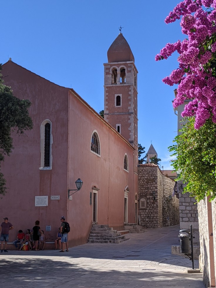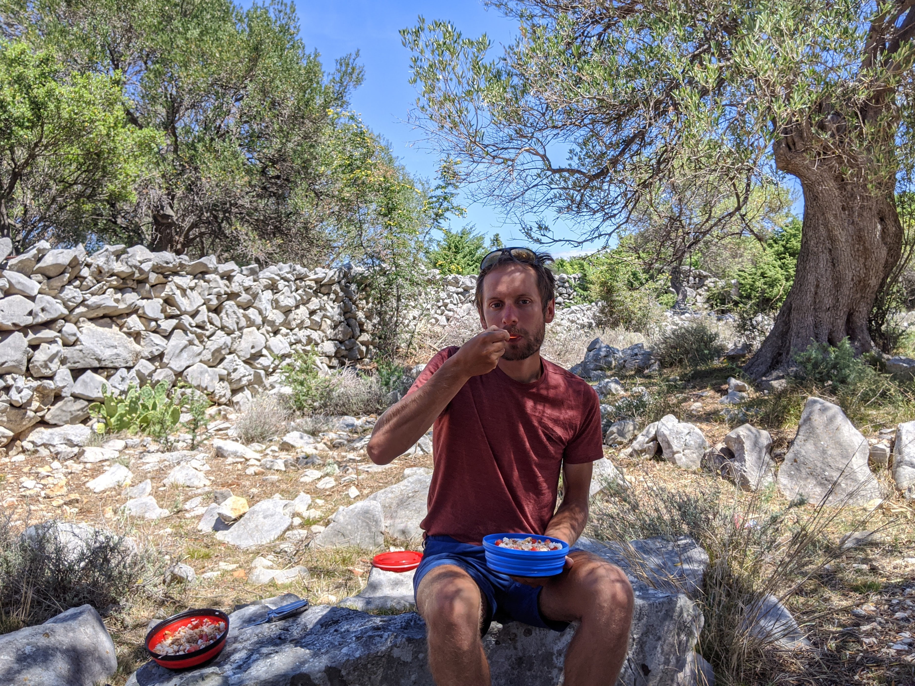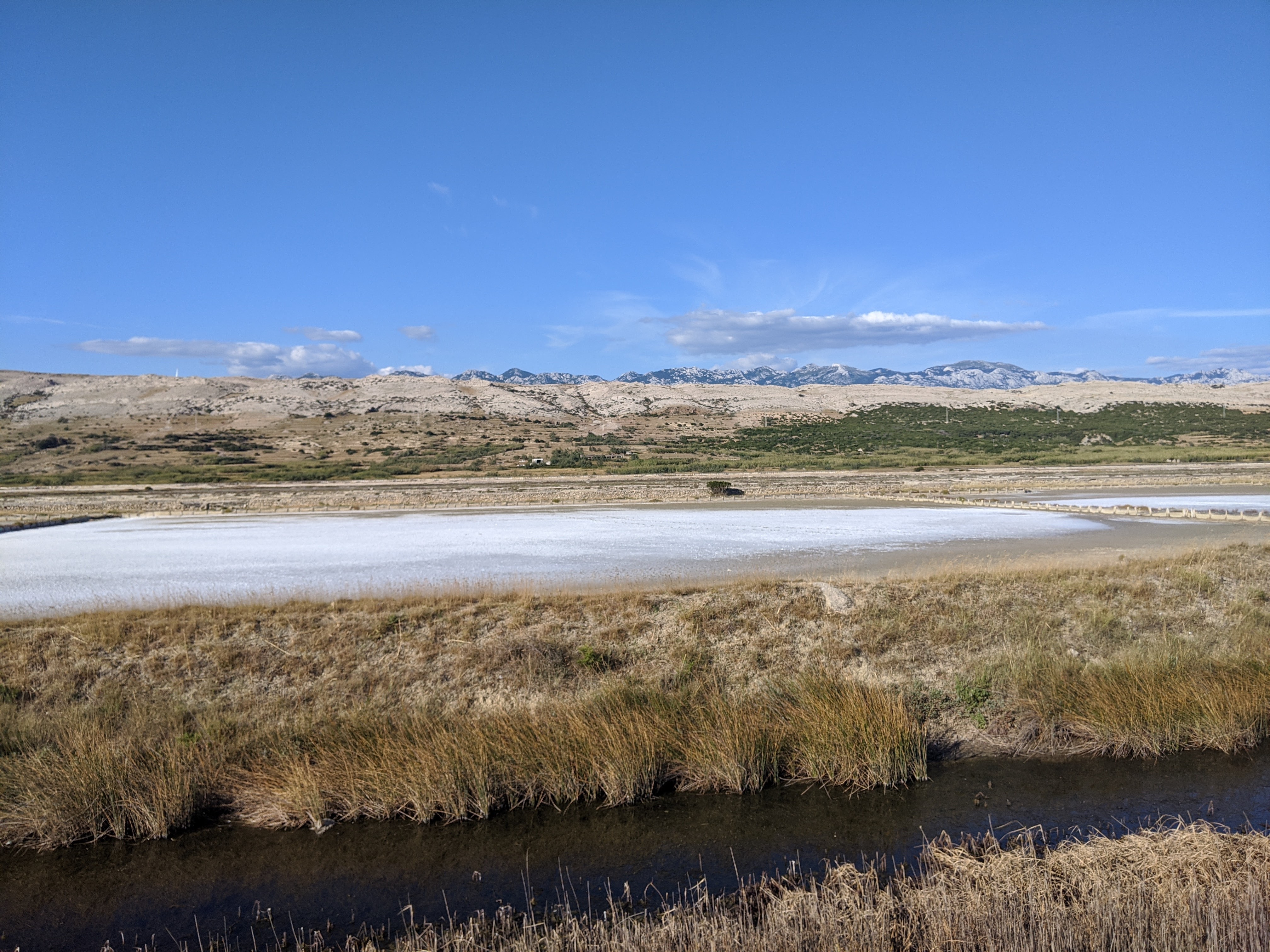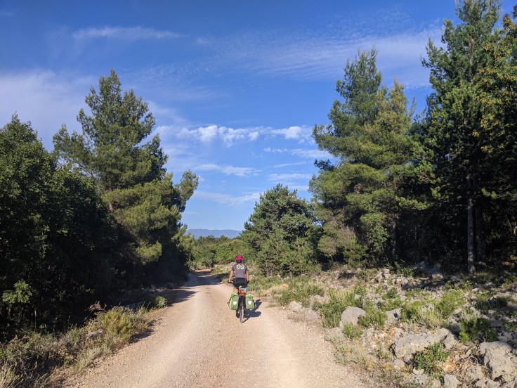 Nous avons un bateau le lendemain midi, bien plus petit que celui de la veille et qui cette fois-ci accepte les vélos. Nous serons d’ailleurs 6 passagers et que des cyclistes ! Toujours aussi arides, les paysages sont assez différents sur l’île de Pag. Ici on pédale au milieu des oliviers bordés de murets en pierres sèches avec bien évidemment la mer en toile de fond. C’est splendide !