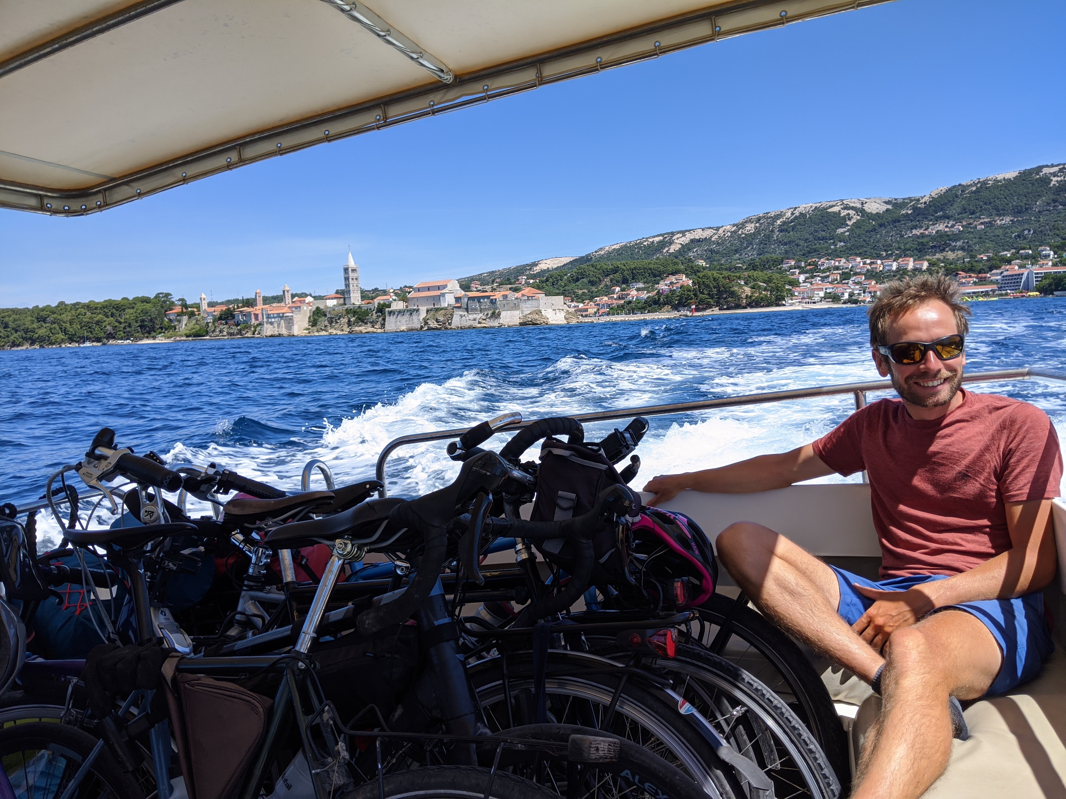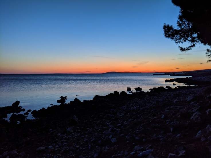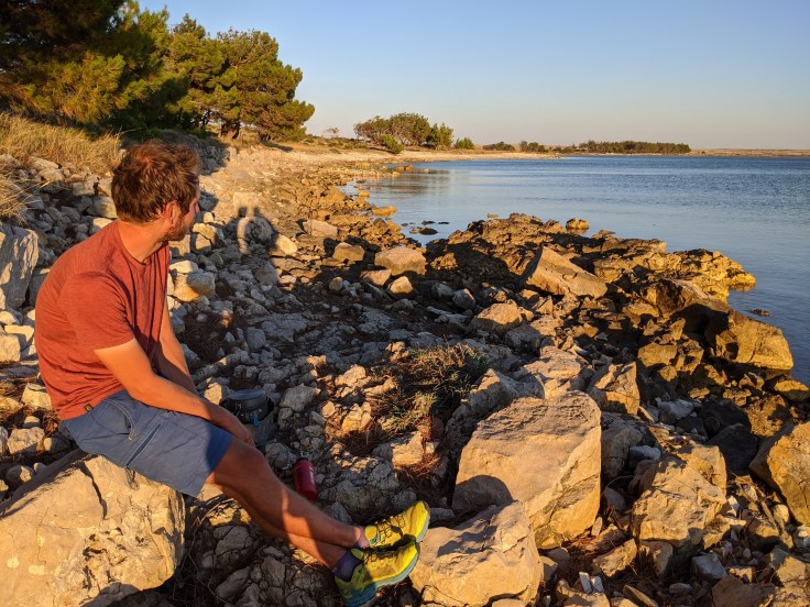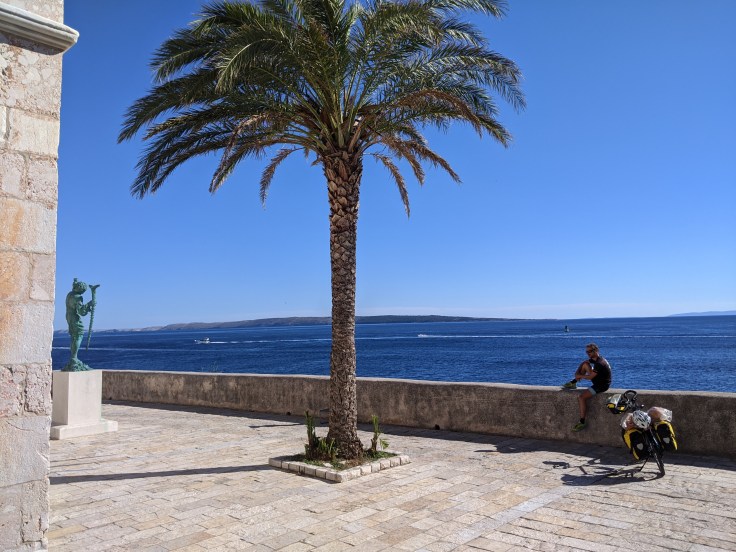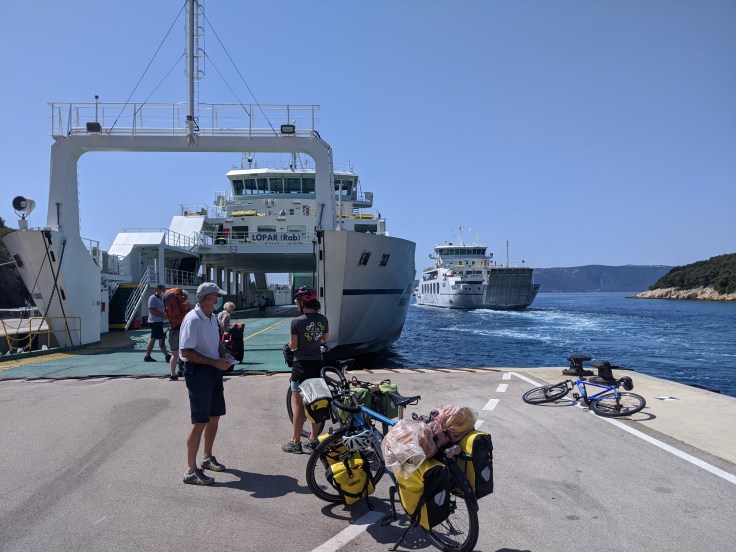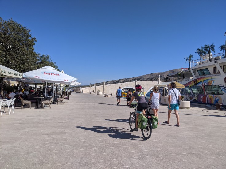 En fin de journée, nous nous dirigeons vers le port pour embarquer en direction de l’île de Pag. Malheureusement, les vélos sont interdits dans le bateau. Tant pis, nous faisons demi-tour pour aller nous baigner avant de passer une nouvelle nuit au bord de l’eau.