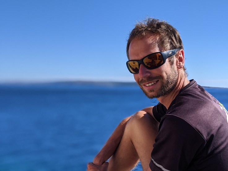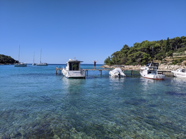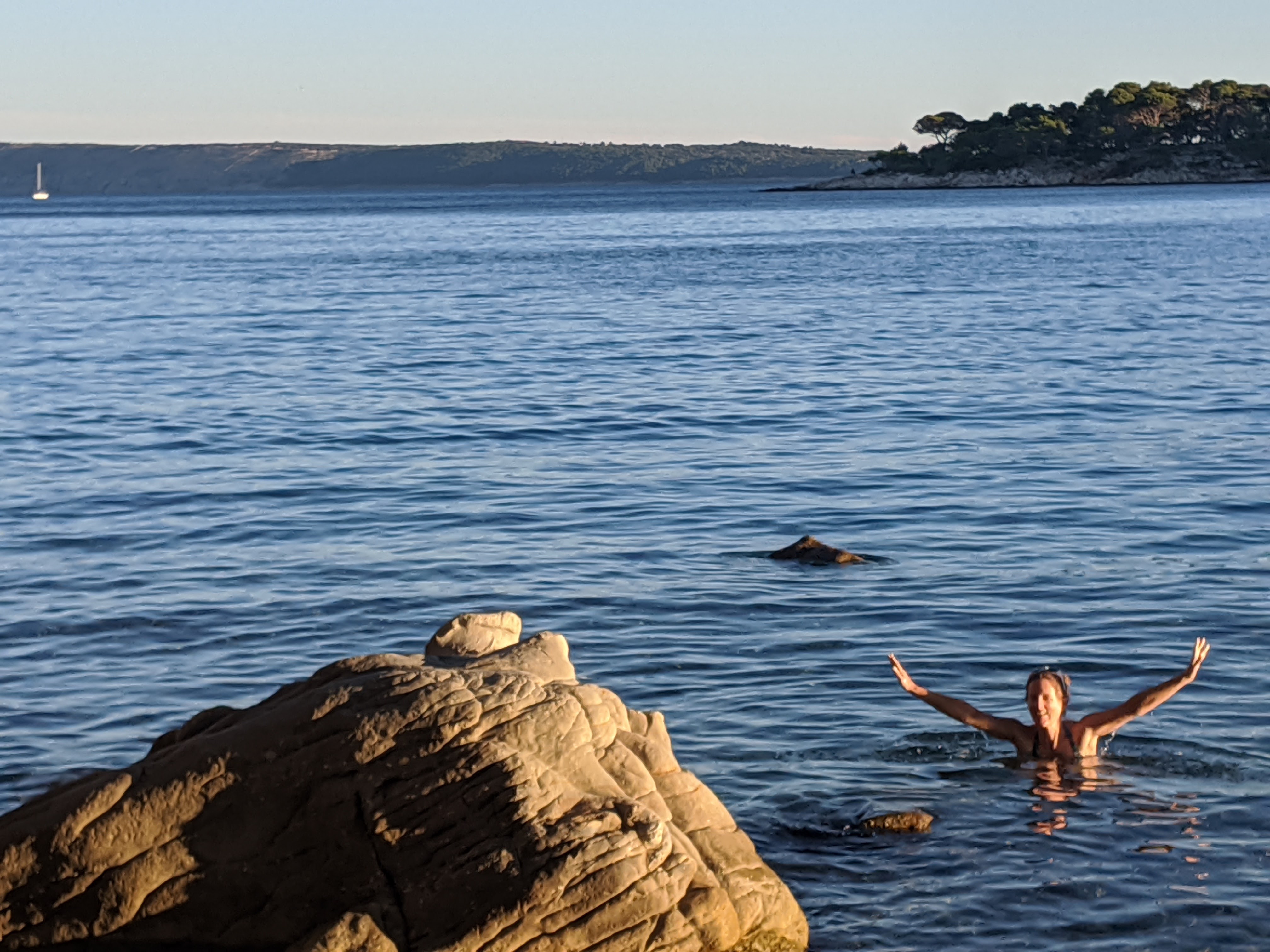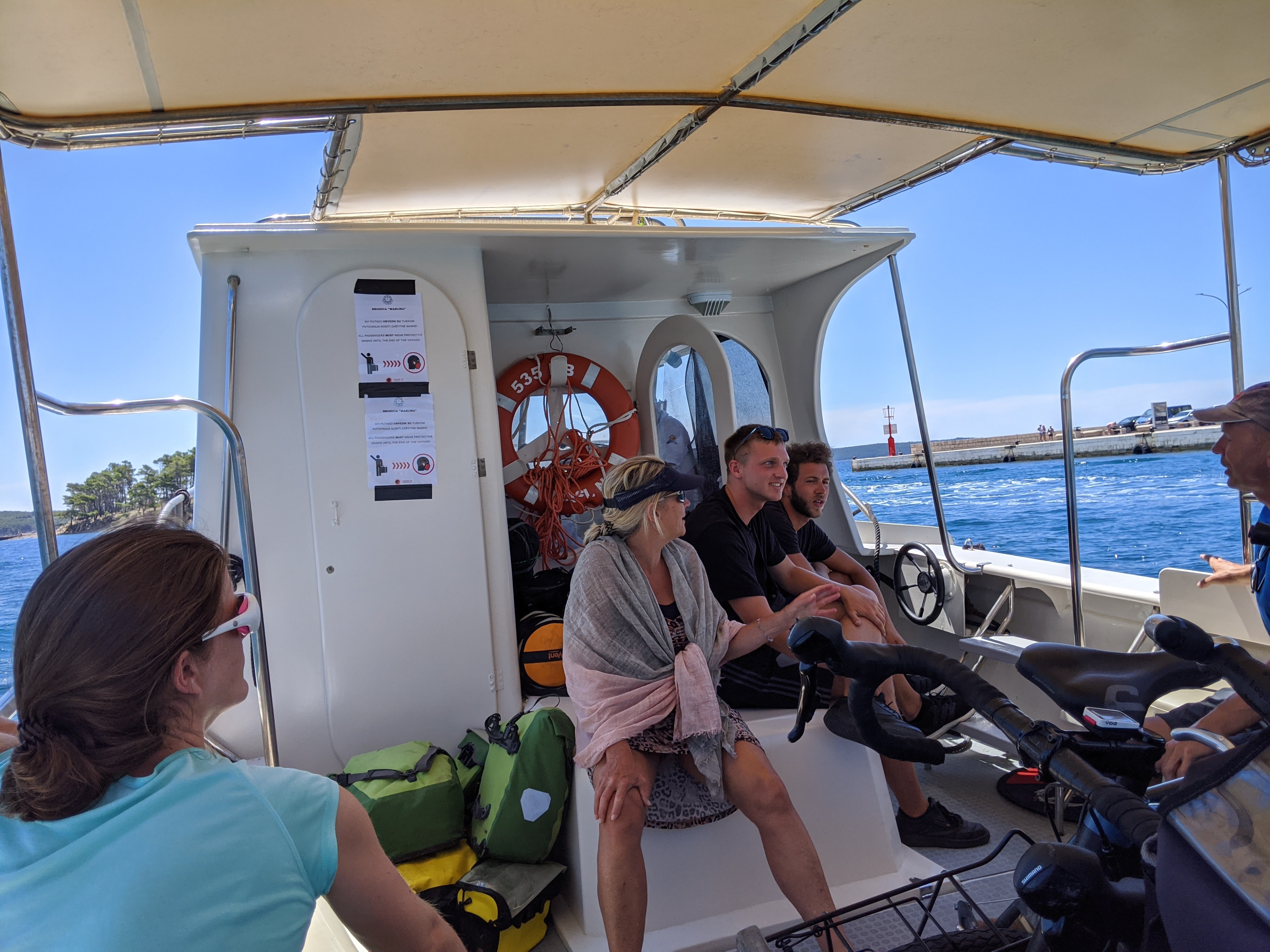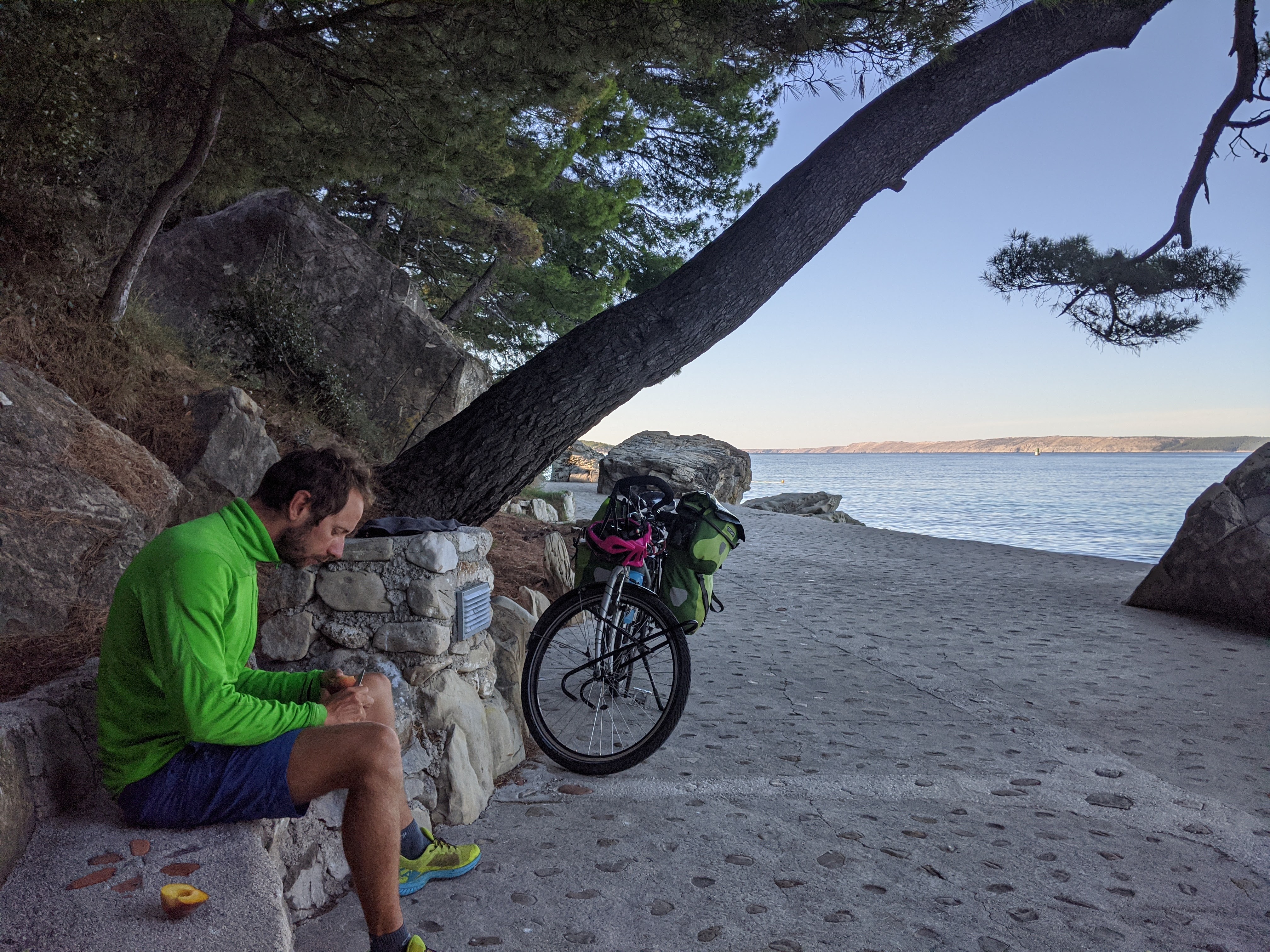 En fin de journée, nous nous dirigeons vers le port pour embarquer en direction de l’île de Pag. Malheureusement, les vélos sont interdits dans le bateau. Tant pis, nous faisons demi-tour pour aller nous baigner avant de passer une nouvelle nuit au bord de l’eau.