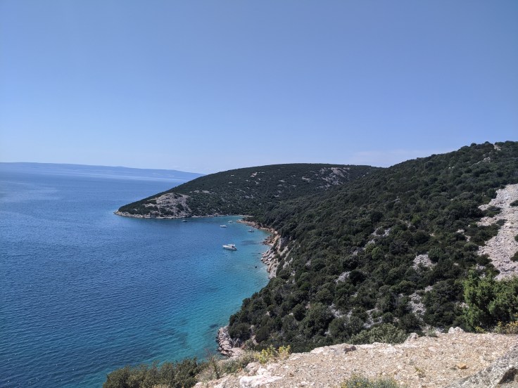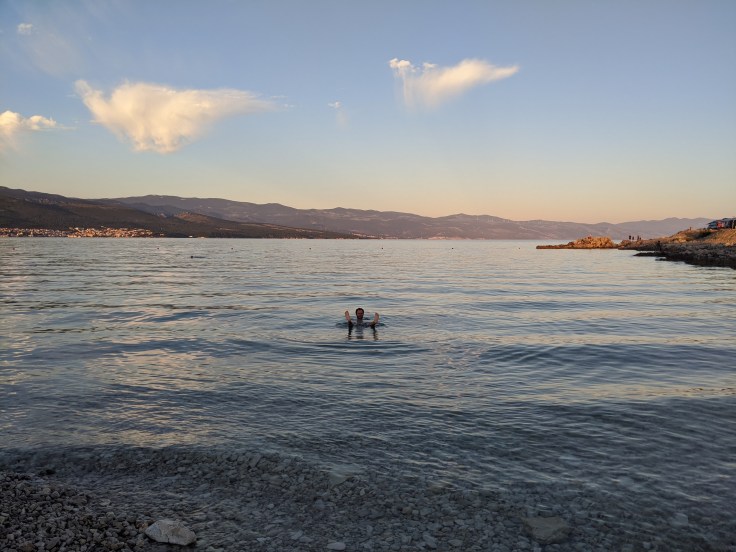 Nous arrivons en Croatie par la côte, où nous sommes tout de suite marqués par les paysages très arides. Sans plus attendre, direction l’île de Krk (on vous passe la prononciation) qui se trouve être la deuxième plus grande île du pays. Reliée au continent par un pont, cela s’en ressent au niveau de la circulation ! Nous profitons dès le soir même de notre première baignade dans l’Adriatique.
