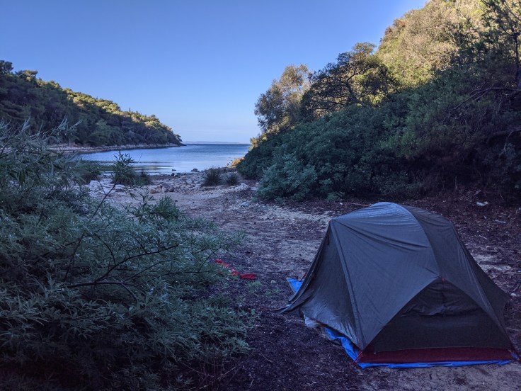 Après un transfert en ferry, nous débarquons sur l’île de Rab. Moins circulée que la précédente, nous rejoignons la péninsule de Suha Punta et partons à la recherche d’une plage pour le campement du soir. Nous posons la tente au bord de l’eau et profitons de cette plage rien que pour nous, avant que deux motards autrichiens nous rejoignent. Le lendemain, nous suivons un itinéraire vélo sur une piste ombragée par des forêts de pins, fort agréable. Nous découvrons de magnifiques points de vue et de superbes criques où l’eau turquoise invite à la baignade.