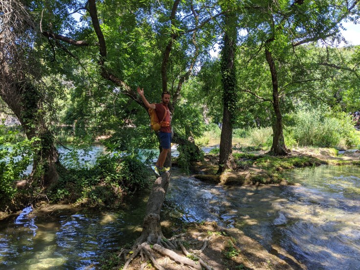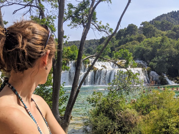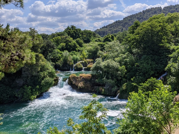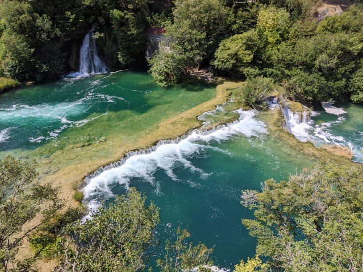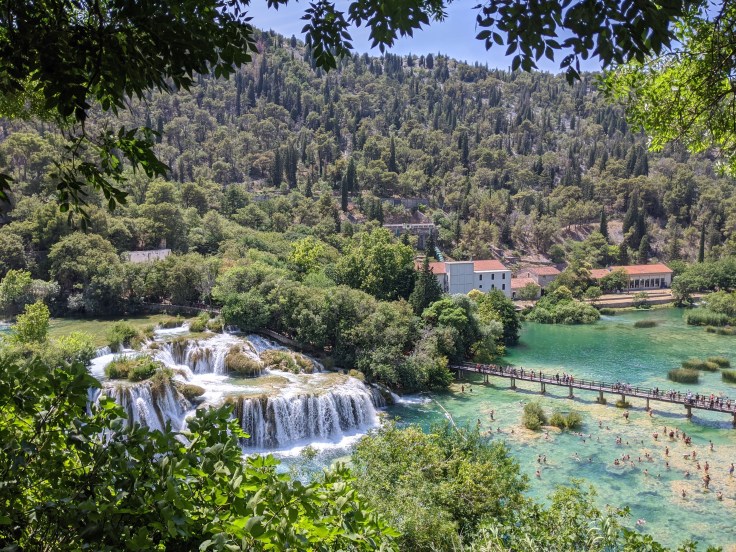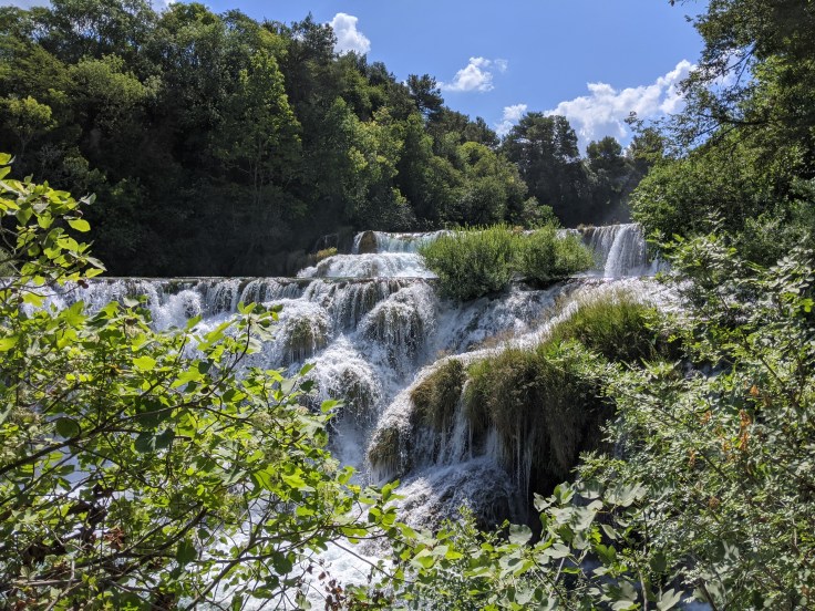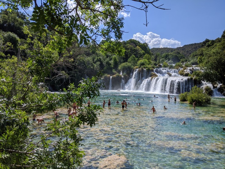 De retour sur le continent, nous atteignons le point le plus au sud de notre voyage avec la découverte du parc de Krka. Pour la première fois en Croatie, nous trouvons de la verdure, et quelle verdure, une végétation luxuriante au bord de la rivière Krka avec une multitude de cascades. Le lieu est féérique ! Nous déambulons sur les pontons en bois pour découvrir ce site naturel toutefois bien aménagé. Nous clôturons cette belle journée par une baignade au pied de la cascade la plus impressionnante.