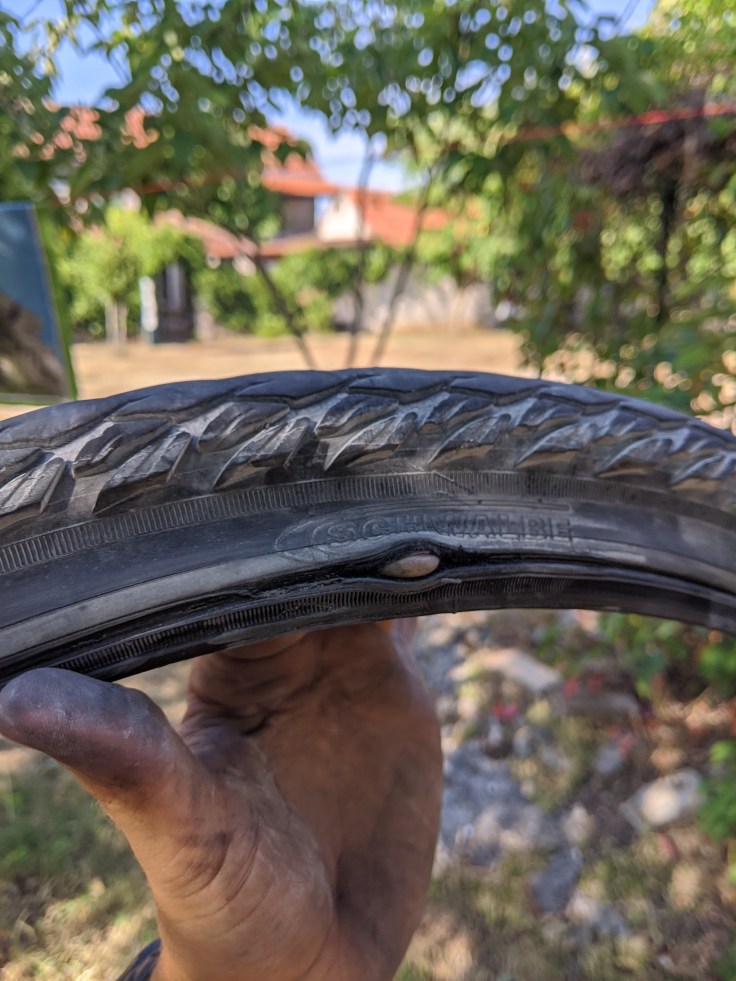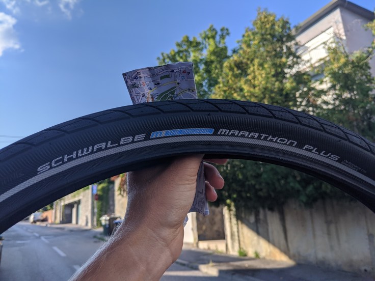 En fin d’après-midi, nous faisons un tout autre genre de visite, celle des magasins de vélo. Premier problème mécanique, Fabien roule avec un pneu déchiré depuis presque 300 km. Après plusieurs boutiques, nous parvenons à mettre la main sur la rolls du voyageur, un Schwalbe marathon.