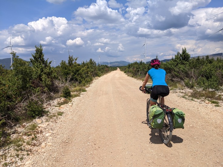 Pour la suite du voyage, nous avons plusieurs idées en tête : poursuivre vers le sud jusqu’à Athènes voire Istanbul ou alors remonter vers Budapest. La chaleur et l’incertitude des transports pour le retour nous font pencher pour la seconde option. La route la plus directe passe par la Bosnie-Herzégovine. L’idée de découvrir un nouveau pays nous réjouit. Alors que nous sommes à une demi-journée de vélo de la frontière, un rapide coup d’oeil sur internet pour nous informer de la situation sanitaire nous stoppe net. La frontière est encore fermée aux membres de l’UE. Nous remontons donc en restant côté croate. L’arrière-pays nous donne à voir un tout autre visage de la Croatie, loin des villes touristiques du littoral. Nous traversons une région complètement laissée à l’abandon. Les maisons tombent en ruine, des villages entiers sont désertés, les commerces sont rares. Nous comprendrons un peu plus tard, que cette partie du pays était autrefois habitée par des familles serbes qui ont fuit pendant les guerres d’ex-Yougoslavie entre 1991 et 1995.