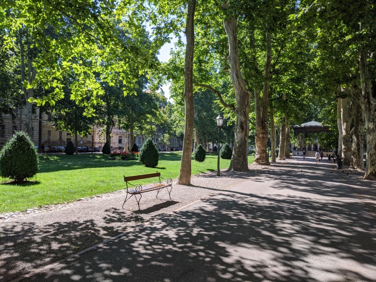 Nous profitons d’une pause bien méritée dans un restaurant où nous ressortirons un peu déçus avant de partir à l’assaut de la ville basse et de ses parcs ombragés.